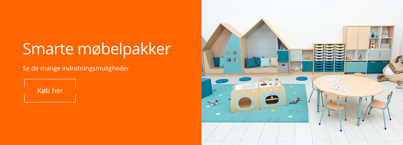 - Børnehavepakke: Indretning med børnestole, borde og opbevaringsmøbler.